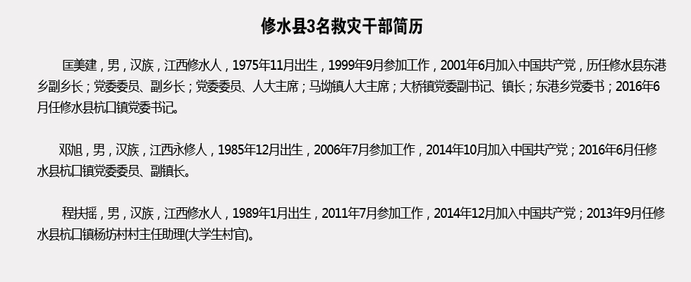 事發經過:當晚,受修河水位上漲影響,杭口鎮受災嚴重,該鎮黨委書記匡美建、副鎮長鄧旭、大學生村官程扶搖三人趕赴現場組織疏散民眾,途中不幸被洪水沖走。
