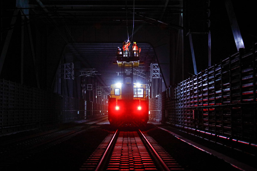 跨海大橋上接觸網作業車正在檢修作業 胡鵬 攝 2月1日凌晨,在平潭海峽公鐵兩用大橋上,寒風呼嘯,福州供電段的一群海上“蜘蛛俠”正在6米高的接觸網作業車平臺上檢修作業。由于大橋所處地理位置特殊,海面上空氣中鹽分含量很高,接觸網絕緣子上附著一層細細的鹽粒,如果不及時清除,易造成絕緣子放電、閃絡引起接…[詳細]