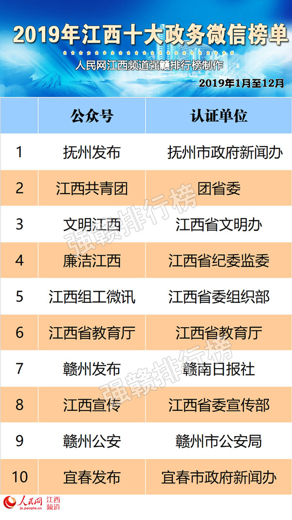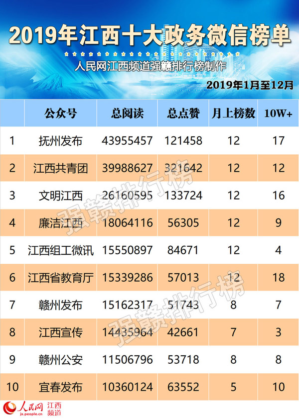 經過長時間統計分析,人民網江西頻道強贛排行榜今天推出2019年江西十大政務微信榜。榜單以一年來江西省主要政務微信公眾號月度排名為參考,綜合考量公眾號在不同時間段的不同表現,最終選出十大公眾號。