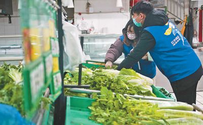 2月5日,在江蘇南京江寧區秣陵街道牛首社區一家超市,網格員陶慧(左)、王俊在幫助居家隔離的居民買菜。新華社記者 季春鵬攝