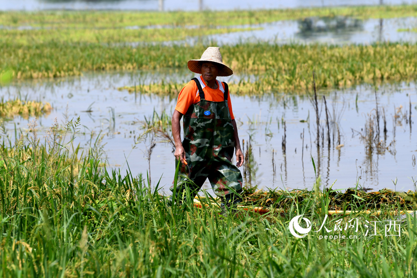 老郭在洪水中“收割”水稻(人民網 時雨/攝)