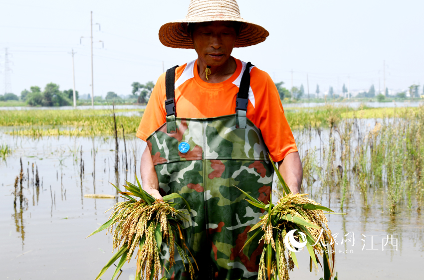 看著即將成熟的水稻被淹,老郭說希望洪水盡早退去,補種晚稻挽回損失。(人民網 時雨/攝)