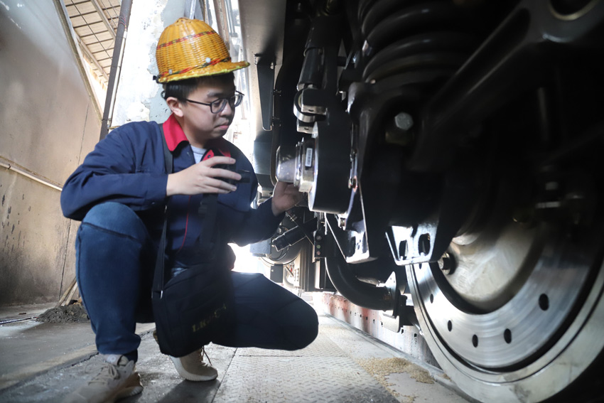 職工正在對車底信號設備進行檢查。李正緯 攝