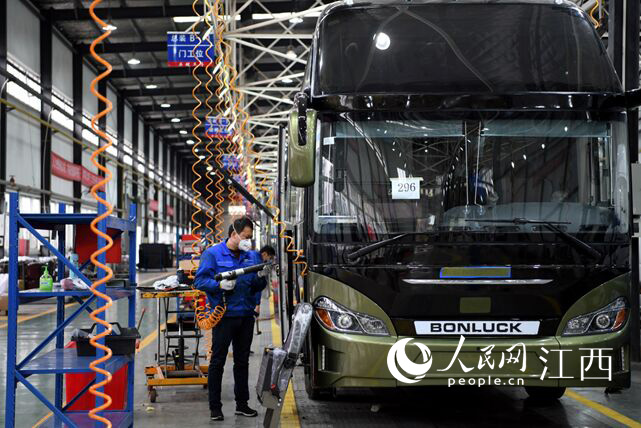 2020年2月19日,南昌市經開區百路佳有限公司的總裝車間內,工作人員正在對客車進行總裝,這批客車完工后將發往中東。人民網 時雨攝