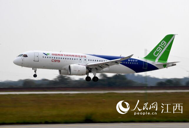 2020年10月31日,一架由中國商飛公司生產制造的C919飛機從南昌瑤湖機場起飛,為現場觀眾進行了首次全球航展動態展示。當日,2020南昌飛行大會在這里開幕。人民網 時雨攝