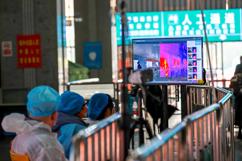 出站口,醫務人員堅守崗位,嚴格監測每名出站旅客的體溫。鄒陽 攝
