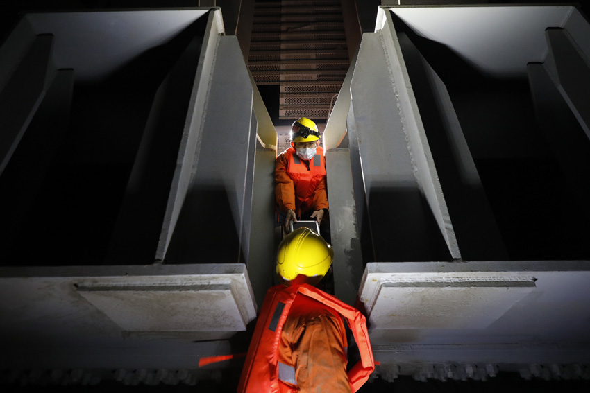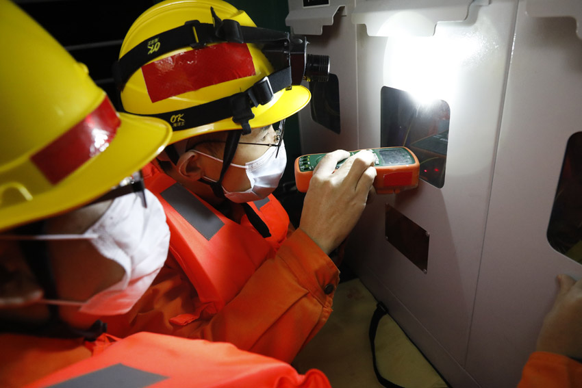 地埋變安裝在橋墩處,距離橋面約5米左右,他們必須從橋邊風屏障開的小口鉆出去,沿著一個簡易的梯子往下爬,才能到達安裝地埋變僅7平方米左右的小平臺。在平臺上檢修不是件容易的事,腳下就是40多米波濤洶涌的大海,耳邊都是呼呼的風聲和海浪聲,不僅要做好防風措施,還得爭分奪秒完成檢修任務,大橋上的地埋變共有9臺,每個月要巡視檢查一次,檢查項點很多。半小時后第一臺地埋變檢修完成,活動了一下冰涼的手腳,劉坤和林鴻強沿著梯子爬回橋面,他們要背著工具材料,步行將近1公里到達下一個作業地點。燈光下,隨著疾行的腳步,他們的身影越拉越長。幾個小時后,2021年春運的第一趟動車將沿著他們的足跡,從大橋上通過。(張志霞、胡鵬)