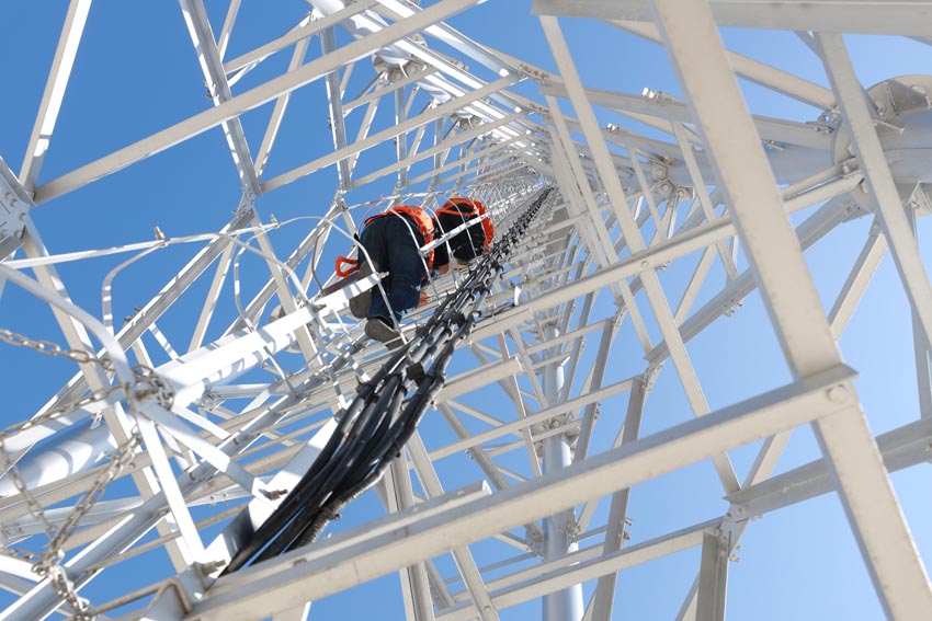 攀爬至35米高的第二作業平臺,邱民芳與工友相互檢查安全帶系扣情況,準備開始檢修作業。丁波 攝