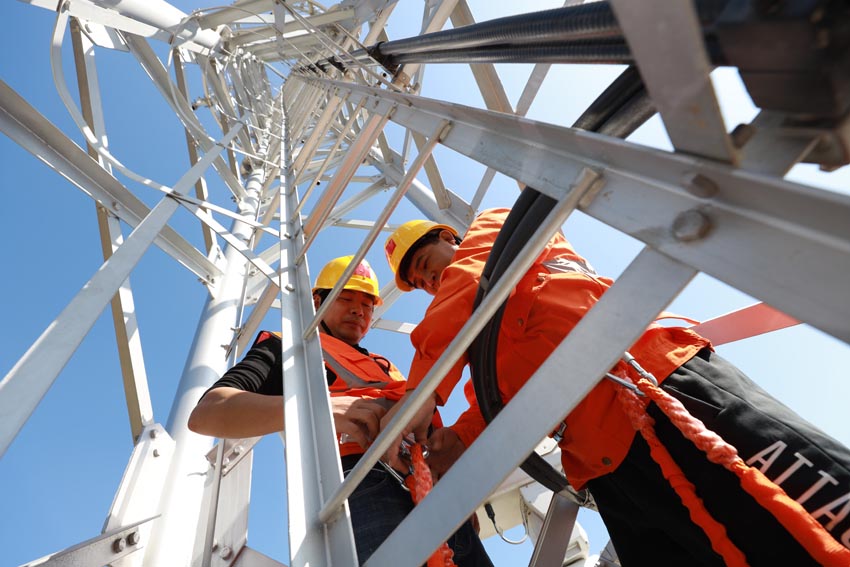 “我們通信設備常年暴露在戶外,防銹防蝕特別重要,以往包一層的防水膠帶這里需要包三層,裸露的金屬部位噴了防銹漆還得再抹層黃油!鼻衩穹寂郎纤鈬娖,在海風的助力下,鐵塔的晃動愈發明顯。