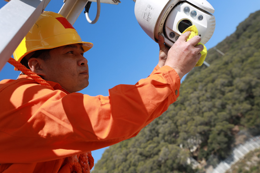 掏出抹布和防銹噴漆,邱民芳開始逐個檢查、擦拭安裝在塔頂的信號及監控設備。平潭海峽公鐵大橋上的幾百個傳感和視頻設備產生的海量數據,需要通過這座矗立在福平鐵路海門隧道出口外的信號塔,完成和數據中心的信息交換。塔頂安裝的天線與動車組車頂的 GPS、通信天線完成信號發射、接收交互,確保列車通過大橋時各項指令能夠及時、迅速傳達無死角。