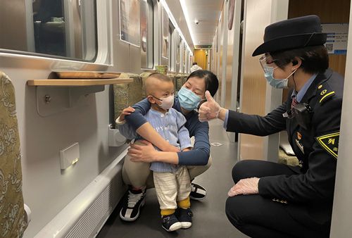 列車長稱贊小朋友口罩戴得好。(人民網楊曦 攝)