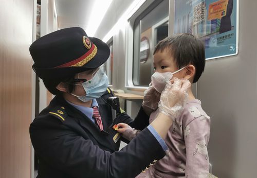 口罩、護目鏡、手套,是列車上所有工作人員的標配。若發現乘客在旅途中沒有戴好口罩,他們也會時刻提醒!靶∨笥,你的口罩呢?來讓阿姨幫你戴上!绷熊囬L曾穎一邊蹲下身,一邊從小女孩媽媽手中接過口罩為她仔細戴好。