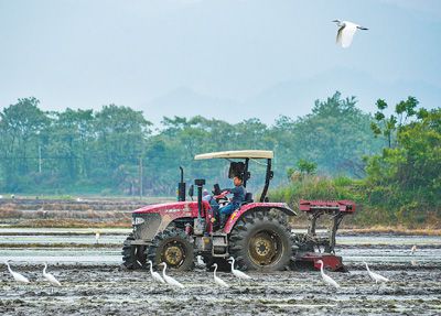 4月7日,江西省吉安市遂川縣枚江鎮田野里,農民駕駛拖拉機在平整早稻田,一群白鷺圍著覓食,構成一幅人與自然和諧相處的春耕圖。