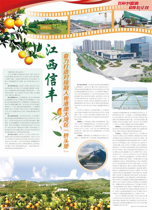 產業融入。在做強電子信息首位產業上,作為贛州電子信息產業帶核心區的信豐持續深入粵港澳大灣區開展針對性招商引資活動,持續抓好電子信息首位產業招商。聚焦5G和智能制造領域,積極承接粵港澳大灣區產業轉移。設立5G產業發展基金,引進行業領先龍頭企業,推動5G產業補鏈、強鏈、壯鏈,打造5G產業聚集區,深化與粵港澳大灣區柔性引才引智合作,推動粵港澳大灣區科研孵化成果在信豐生產轉化。著力打造全省數字經濟發展高地,引進5G關聯企業28家,建成贛州5G產業發展研究院,打造5G應用研究平臺。目前,電子信息首位產業年總產值已超100億元。在現代農業高質量發展上,作為贛州優質農產品集散地、粵港澳大灣區“菜籃子”產品贛州配送分中心暨冷鏈物流中心的信豐,發揮國家現代農業示范區、國家現代農業產業園、國家現代農業科技示范展示基地三大平臺作用,按照“擴規模、育龍頭、建平臺、補鏈條、保要素、強體系”的系統思路,推動現代農業高質量發展。建立臍橙、蔬菜大數據中心,創建全國數字農業試點縣、“互聯網+”農產品出村進城工程試點縣,建設富硒農產品技術創新中心,培育富硒農產品品牌,打造粵港澳大灣區優質農產品供應基地。建成投用蔬菜配套產業園,保障蔬菜產業發展所需的建材、物資、農資供應以及配套服務;建成全國蔬菜質量標準中心(贛州)分中心,集品種引進篩選、技術集成示范、標準制定推廣、質量安全保障、品牌培育認證、產學研融合等功能于一體;建設粵港澳大灣區“菜籃子”產品贛州配送分中心,致力于打造江西省農特產品對接融入粵港澳大灣區的主平臺。2020年,全縣蔬菜種植面積21萬畝,年產量60萬噸,總產值18億元;建成設施蔬菜基地76個、總面積2.3萬畝。