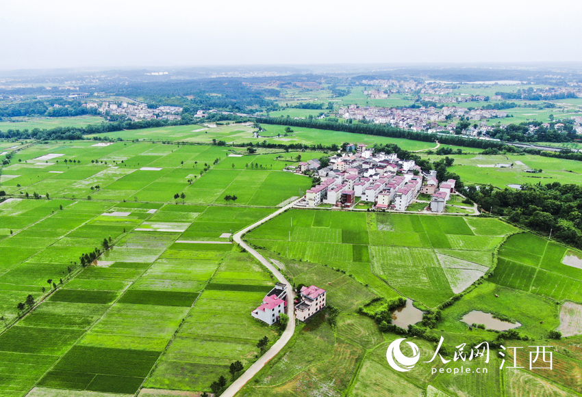 江西省吉安市吉州區長塘鎮廟下村,縱橫交錯的農田與屋舍構成一幅美麗畫卷。(李軍 攝)