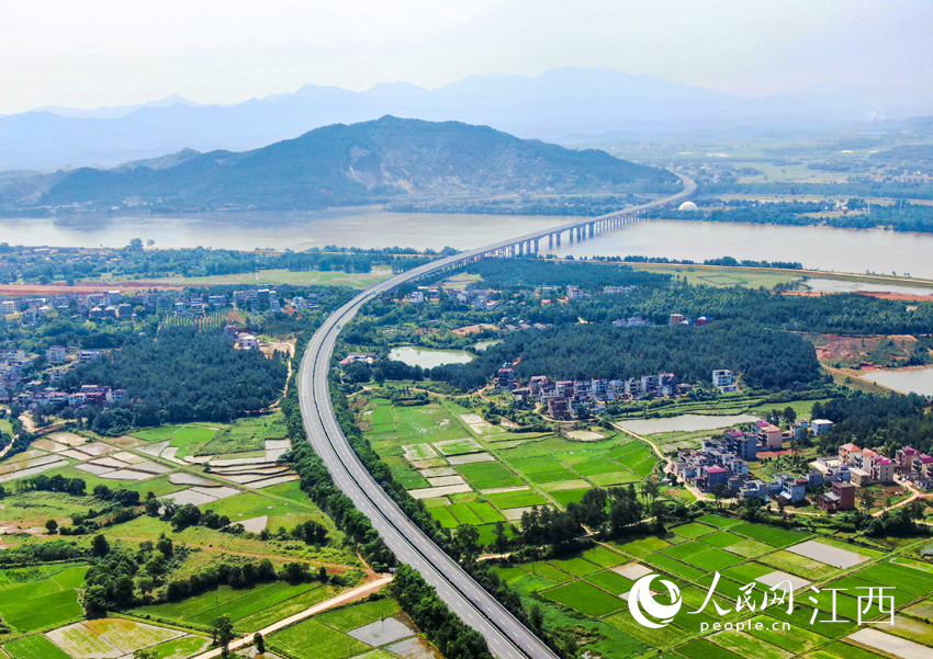 人民網南昌5月16日電 日前,本網通過航拍鏡頭在江西省吉安市吉州區樟山鎮陂上村等地上空看到,高速路在碧綠的田野上穿行,整潔的村莊與青山相映成趣,構成一幅幅美麗的初夏畫卷。