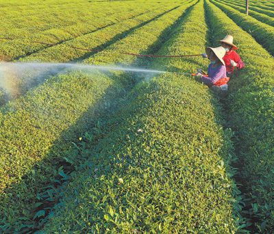 在江西省吉安市泰和縣,茶農正在茶園里防治病蟲害。