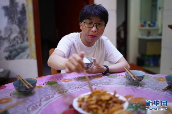 周濤在家里吃飯(6月3日攝)。新華社記者 周密 攝