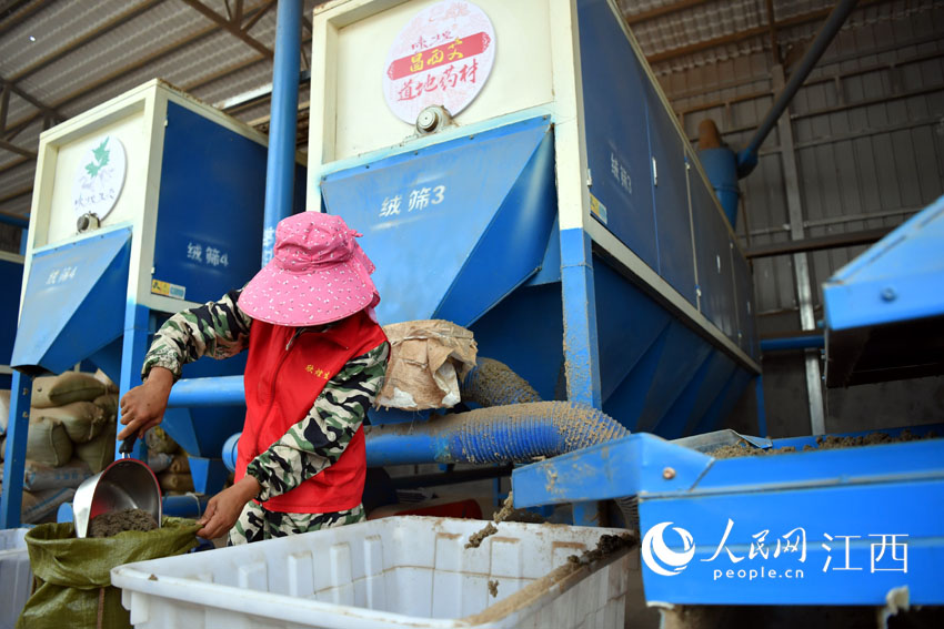 車間內,工人們正操作機器將艾草打絨。(人民網 時雨攝)