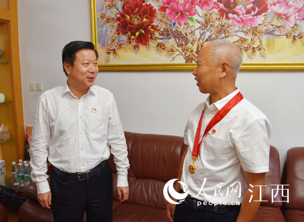 6月25日上午,張鴻星(左)走訪慰問有著52年黨齡的老黨員許洪卿,并為他佩戴“光榮在黨50年”紀念章。