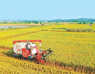 圖為上高縣新界埠鎮洲上村村民在收割早稻。