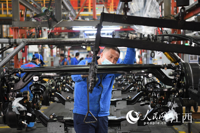 工人正在江鈴汽車底盤制造車間內緊張地忙碌著。人民網 時雨攝