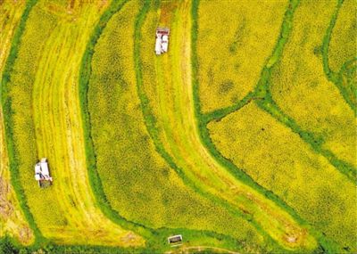 8月13日,江西新余市仙女湖區后元村冷水田超級稻試驗基地,農民駕駛收割機收割水稻。近年來,新余推廣水稻生產全程機械化,大大提高了種、管、收效率和農民種糧積極性。