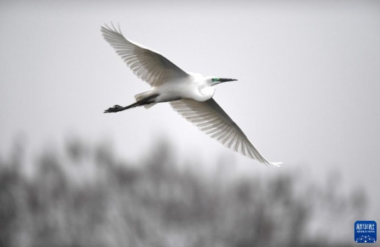 一只白鷺在象山森林公園上空飛翔(3月10日攝)。