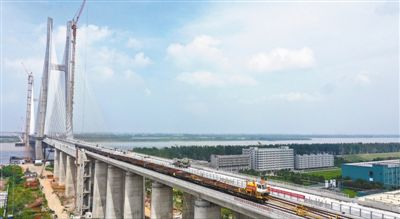 8月29日,安(慶)九(江)高鐵湖北段全線軌道鋪設完成。安九高鐵是中國《中長期鐵路網規劃》中“八縱八橫”高速鐵路中滬漢蓉沿江高鐵和京港高鐵的重要組成部分。圖為當日,中鐵十一局施工人員在鳊魚洲長江大橋施工現場鋪設最后一對500米長軌。