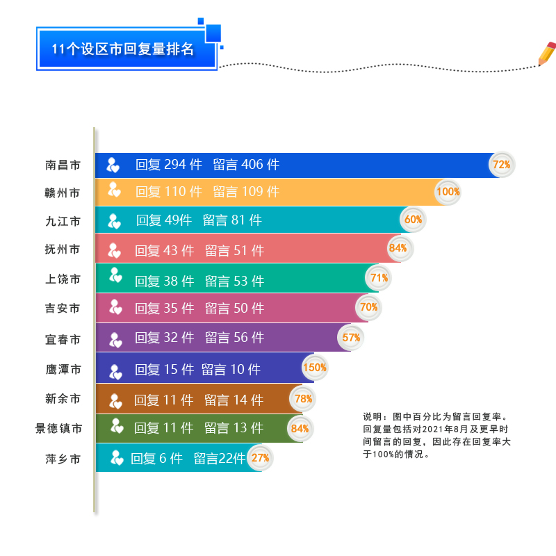 2021年8月1日至8月31日,江西省留言回復率為59%,其中,九個設區市回復率超過59%,分別是南昌市(72%)、景德鎮市(84%)、九江市(60%)、新余市(78%)、鷹潭市(150%)、贛州市(100%)、吉安市(70%)、撫州市(84%)、上饒市(71%)。萍鄉市(27%)、宜春市(57%)回復率低于總回復率。
