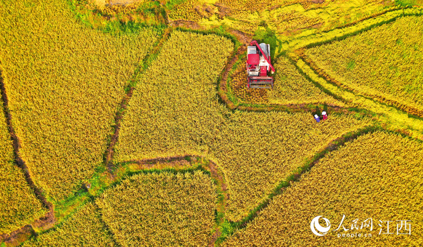 人民網南昌9月23日電 (毛思遠)近日,永豐縣七都鄉牛山村農民駕駛收割機收割水稻。時下,永豐縣的水稻陸續成熟,田野鍍金,農民搶抓晴好天氣收割稻谷,構成一幅幅美好的豐收圖景。