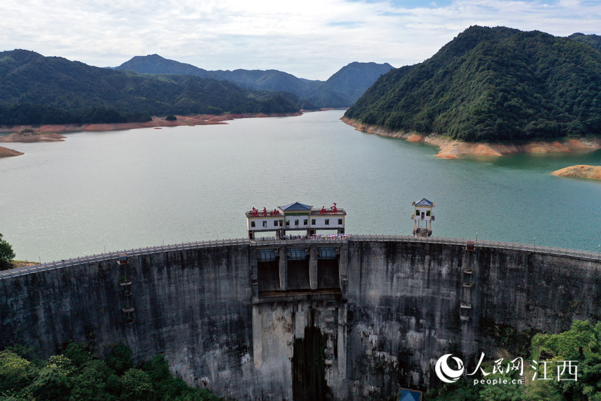 航拍鏡頭下江西省宜黃縣觀音山水庫,該水庫被評為省級水利風景區。人民網 時雨攝