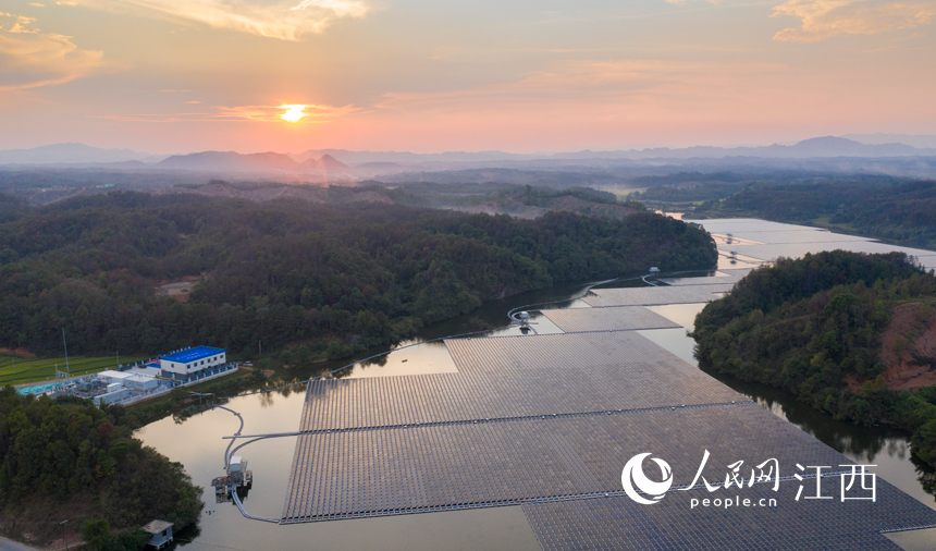 航拍江西萬安漁光互補光伏發電站,一排排光伏板整齊排列。劉仙芬攝