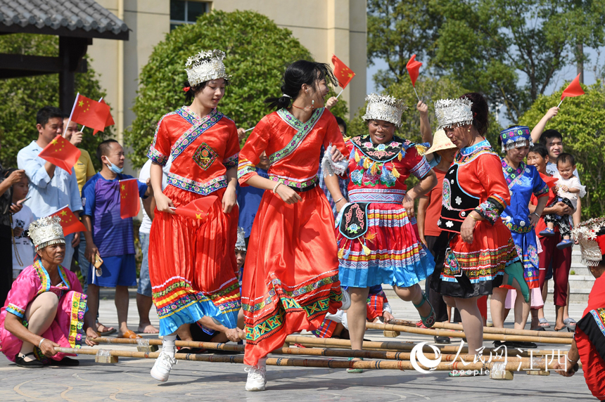 村民與游客一起跳竹竿舞,歡度國慶。周亮攝