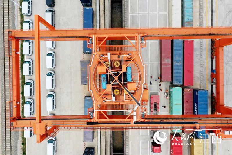 在南昌向塘國際陸港,“江西造”汽車準備搭乘鐵海聯運外貿專列運往海外銷售。 人民網 時雨攝