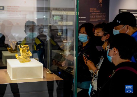 2021年三星堆遺址3號“祭祀坑”出土的金面具,在三星堆博物館開放式文物修復館內展出,吸引了眾多參觀者(10月29日攝)。
