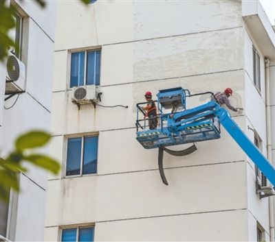 江蘇省宿遷市泗陽縣一小區改造提升施工現場,工人正對小區外墻進行維修補強工作。