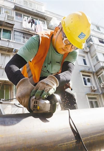 工人在安徽省合肥市瑤海區一老舊小區改造升級現場施工。
