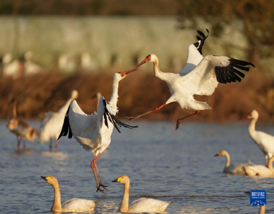 入冬以來,大批候鳥陸續飛抵江西鄱陽湖濕地休養生息。位于鄱陽湖畔南昌高新區鯉魚洲管理處的五星白鶴保護小區里,白鶴、天鵝、鷺鳥等各種候鳥飛翔、覓食,成為鄱陽湖區一道特別的風景。新華社記者 周密 攝