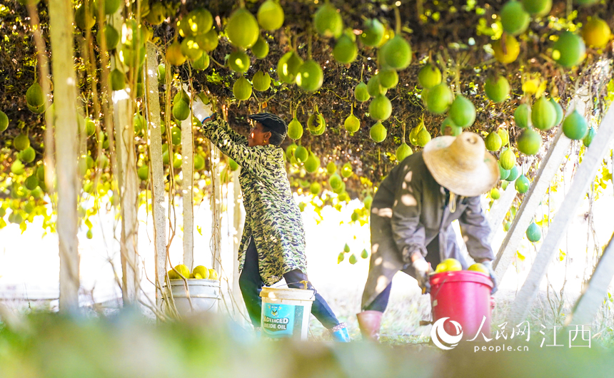 人民網南昌12月5日電 (毛思遠)12月2日,江西省新余市仙女湖區河下鎮平川村瓜蔞種植基地,農戶忙著采摘、加工、晾曬收獲的瓜蔞。近年來,新余市通過調整農產品種植結構,流轉土地規;l展瓜蔞、果凍橙、有機蔬菜、蜜橘等綠色生態農業,引領促進農業提質增效、轉型升級。