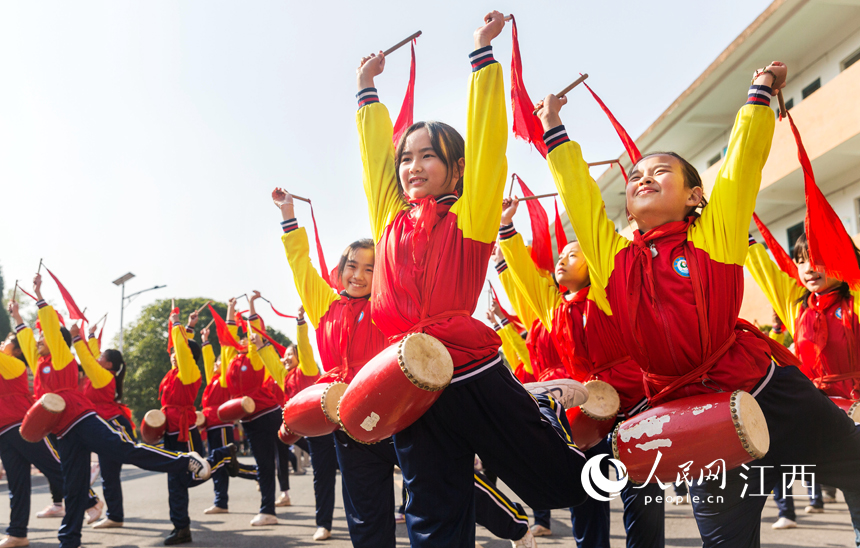 永新縣高溪鄉高溪小學的學生在練習打腰鼓。周亞茂攝