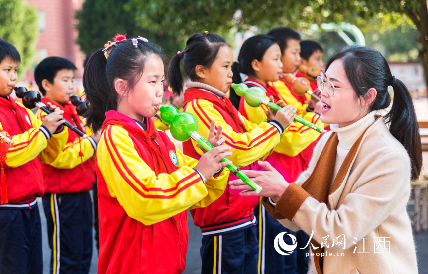永新縣高溪鄉高溪小學的學生在老師的指導下練習吹奏葫蘆絲。周亞茂攝