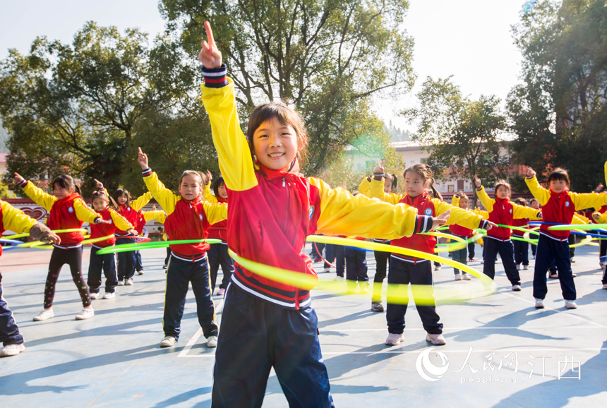 永新縣高溪鄉高溪小學的學生在練習轉呼啦圈。周亞茂攝