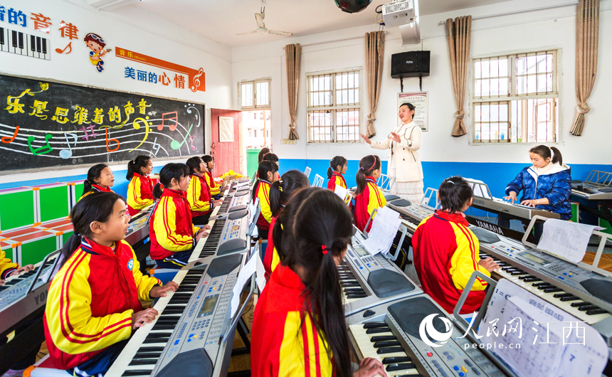 永新縣高溪鄉高溪小學的學生在老師的指導下練習彈奏電子琴。周亞茂攝
