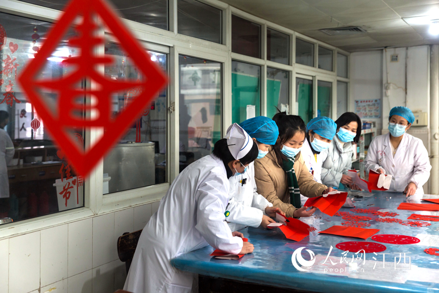 醫護人員與患者家屬一道剪窗花。劉平華攝