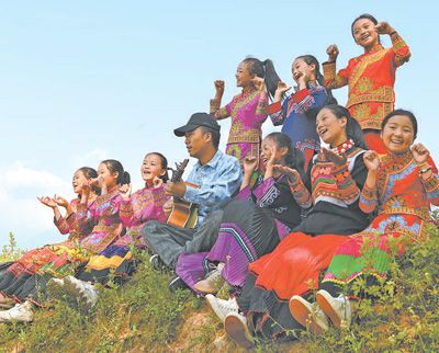 四川省涼山彝族自治州普格縣成功脫貧后,人民群眾生活越來越好。圖為普格縣大槽鄉中心小學老師吉布小龍帶領“妞妞合唱團”成員在唱歌。