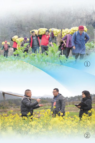 圖①:湖南省龍山縣靛房鎮青年黨員干部在先鋒村幫助村民采收大頭菜。