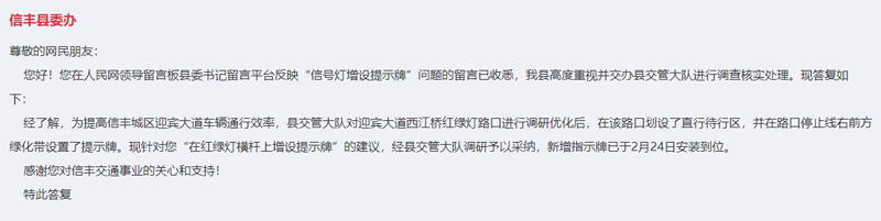 收到網友留言后,該縣高度重視并交辦縣交管大隊進行調查核實處理。經了解,為提高信豐城區迎賓大道車輛通行效率,縣交管大隊對迎賓大道西江橋紅綠燈路口進行調研優化后,在該路口劃設了直行待行區,并在路口停止線右前方綠化帶設置了提示牌。