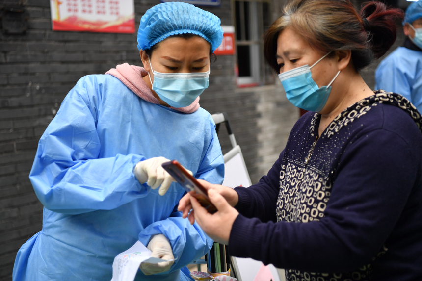南昌珠市學校棉花市校區的老師來到防控一線,協助市民掃碼。 人民網 時雨攝