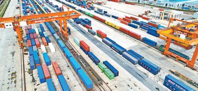 三月十八日,在位于江西省贛州市南康區的贛州國際陸港,起重機在吊裝裝滿出口國外的家具、燈具、服裝等貨物的集裝箱。